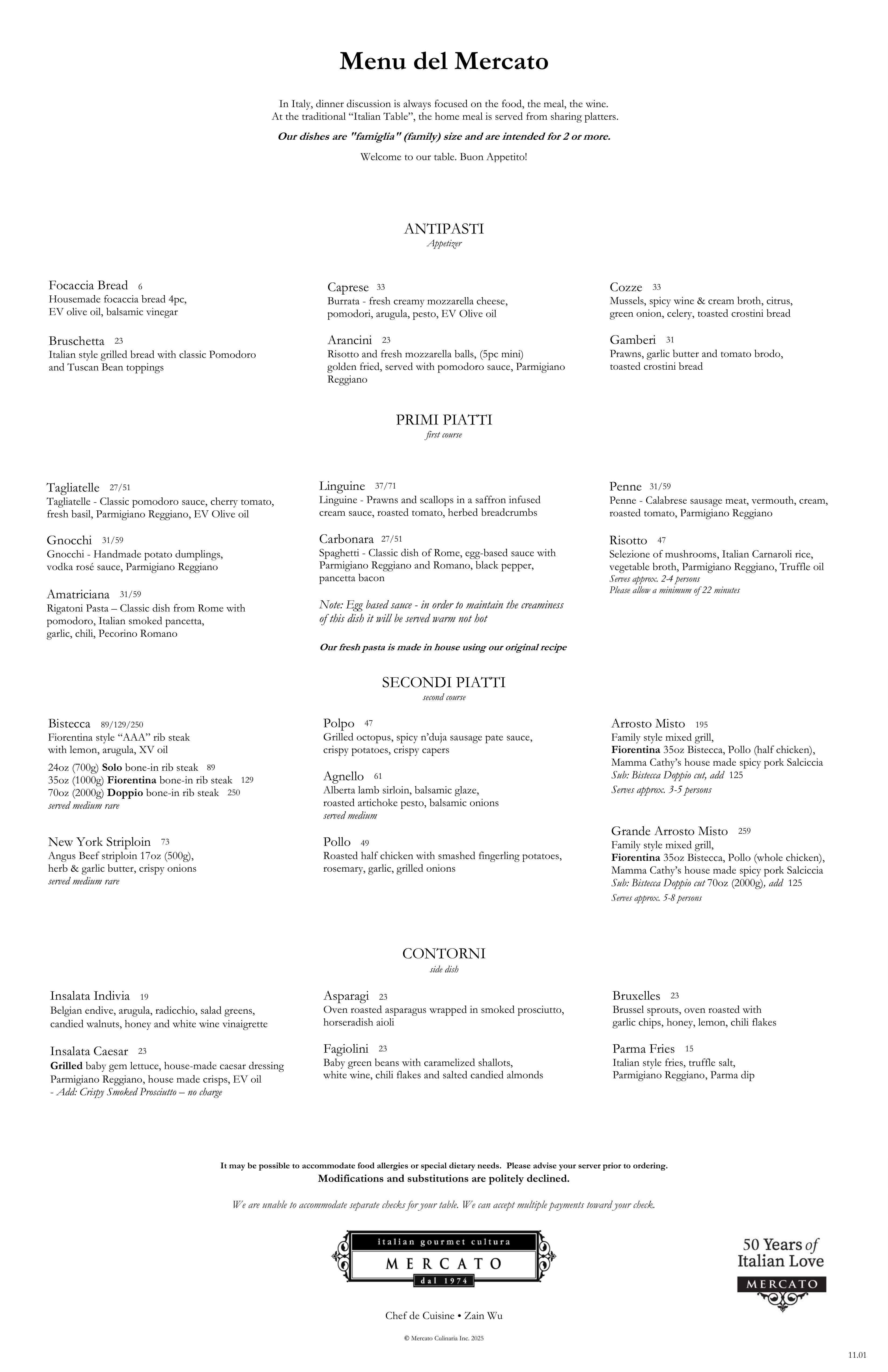 All our dishes are for enjoyment or what we call “famiglia” (family) size dining and are intended for 2 or more.